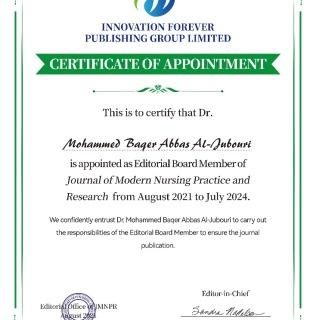 اختيار تدريسي في جامعة بغداد عضوا في هيئة التحرير بمجلة Journal of Modern Nursing Practice and Research الصادرة في الصين