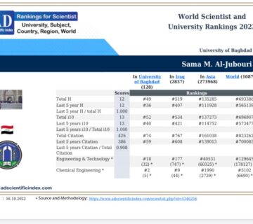 تدريسية من هندسة بغداد تدخل تصنيف الباحثين المتميزين عالمياHuda Hadi03/11/2022دخلت التدريسية في كلية الهندسة قسم الهندسة الكيمياوية جامعة بغداد الأستاذ المساعد الدكتورة سما محمد عبدالله ضمن تصنيف الباحثين والعلماء ... المزيد