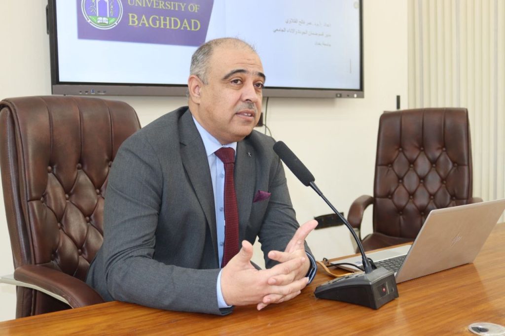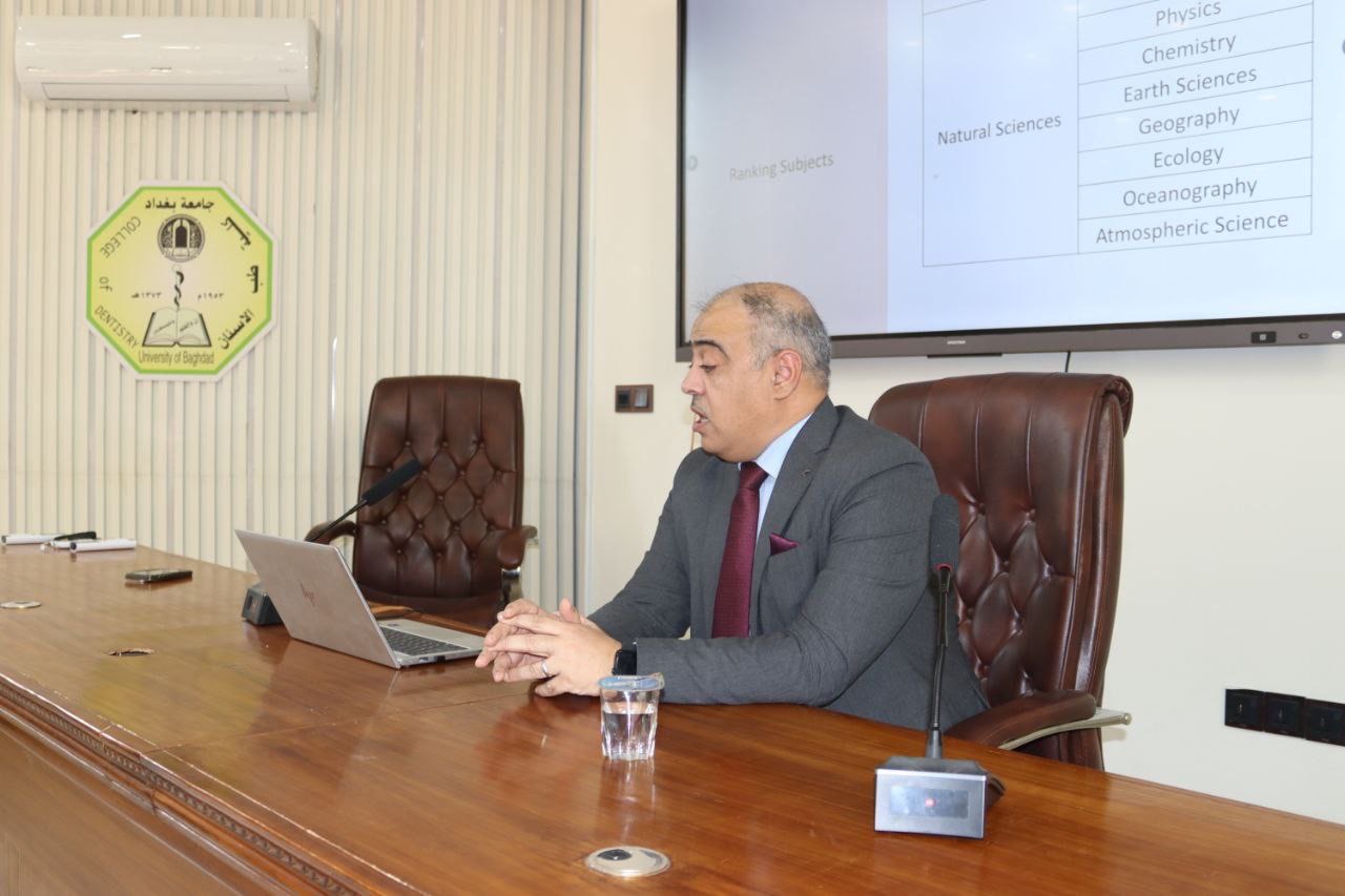 نظمت كلية طب الأسنان في جامعة بغداد، ندوة علمية بعنوان (تحليل مؤشرات البحث العلمي لجامعة بغداد حسب مستوعب WOS) قدمها مدير قسم ضمان الجودة والأداء الجامعي في رئاسة الجامعة الدكتور عمر فالح حسن، بحضور عميد الكلية الأستاذ الدكتور رغد عبد الرزاق الهاشمي وعدد من عمداء تشكيلات الجامعة ومسؤولي وحدات ضمان الجودة ونخبة من التدريسيين.