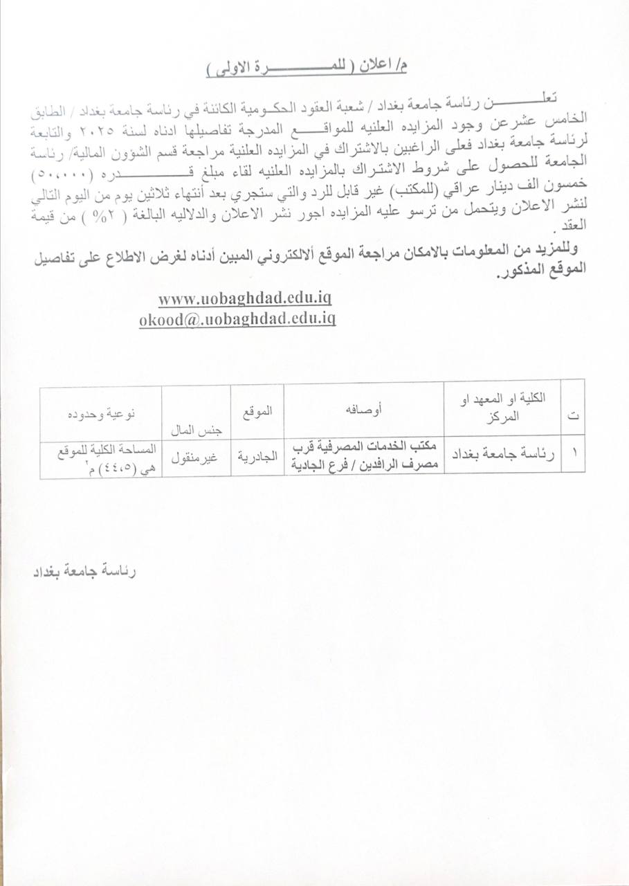 عن وجود مزايدة علنية للمواقع المذكورة تفاصيلها في الموقع ادناه لسنة 2025   والتابعة لرئاسة جامعة بغداد فعلى الراغبين بالاشتراك في المزايدة العلنية مراجعة قسم الشؤون المالية/ رئاسة جامعة بغداد للحصول على شروط الاشتراك بالمزايدة العلنية لقاء مبلغ قدره  (50,000) خمسون  الف دينار عراقي (للمكتب ) غير قابلة للرد والتي ستجري بعد انتهاء ثلاثين يوم من اليوم  التالي لنشر الاعلان ، ويتحمل من ترسو عليه المزايدة اجور نشر الاعلان والدلالية البالغة (٢٪) من قيمة العقد .