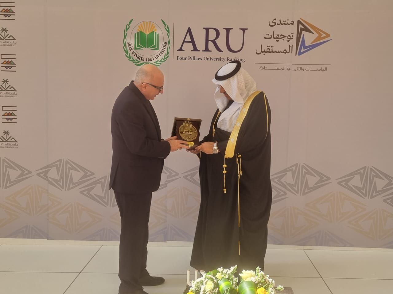 وخلال فعاليات المنتدى ، التقى الأستاذ الدكتور بهاء ابراهيم انصاف رئيس جامعة بغداد ، بالاستاذ الدكتور فالح السلمي رئيس جامعة الملك خالد ، حيث جرى تبادل الدروع التذكارية بين الجامعتين، تقديرًا للعلاقات الأكاديمية والتعاون العلمي المشترك.