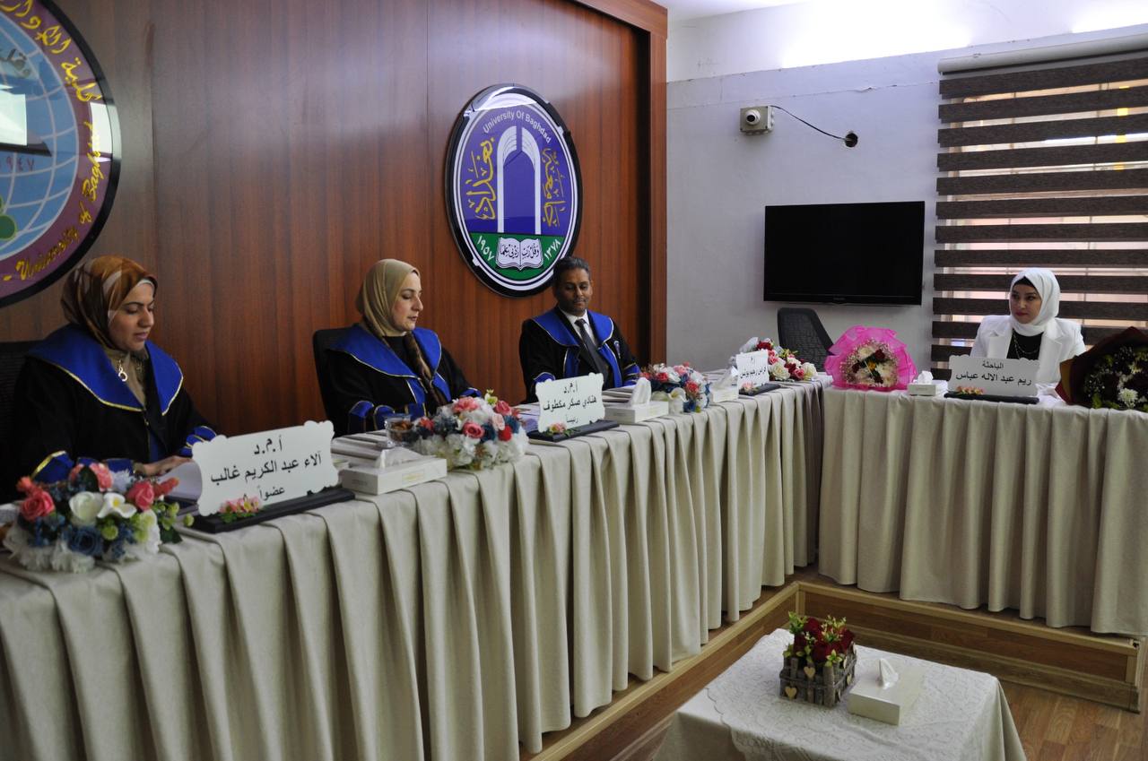 شهدت كلية الادارة والاقتصاد مناقشة بحث الدبلـوم العالـي المعــادل للماجستيـر الموسوم (عوامل النجاح الحرجة لتنفيذ حوكمة تكنولوجيا المعلومات في وزارة الموارد المائية: بحث ميداني) فـــي تخصص التخطيط الاستراتيجي للطالبة (ريم عبدالاله عباس)