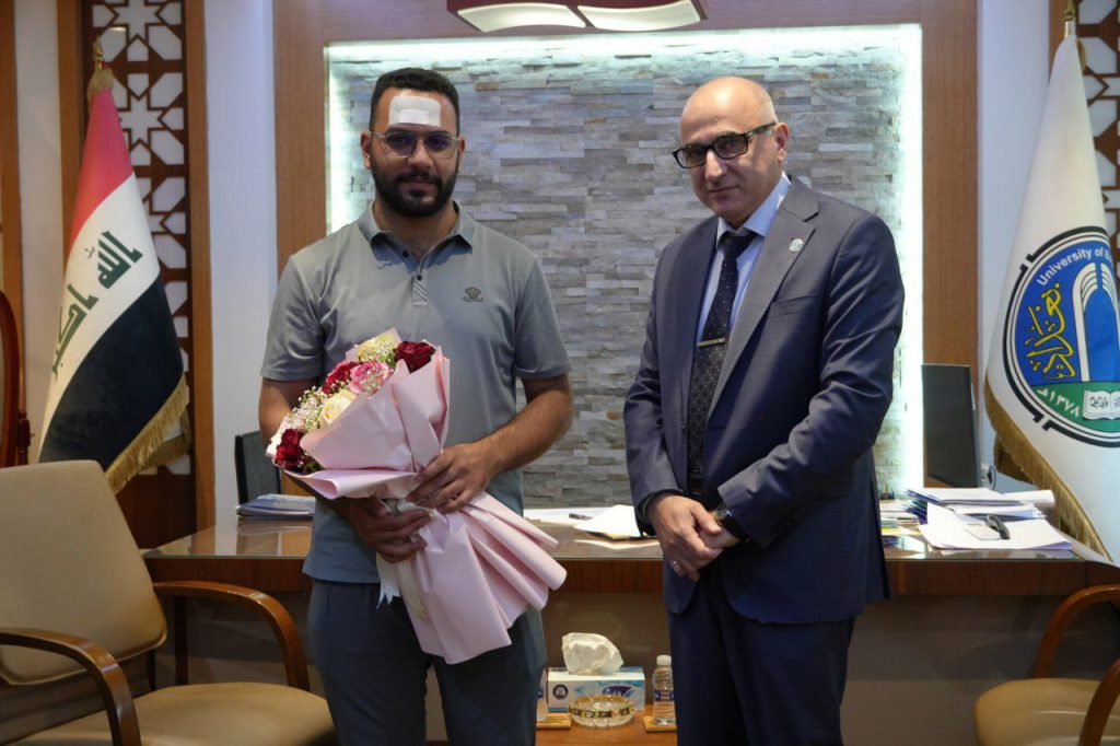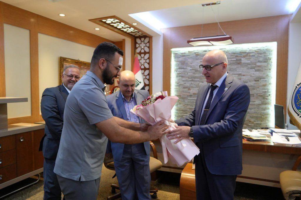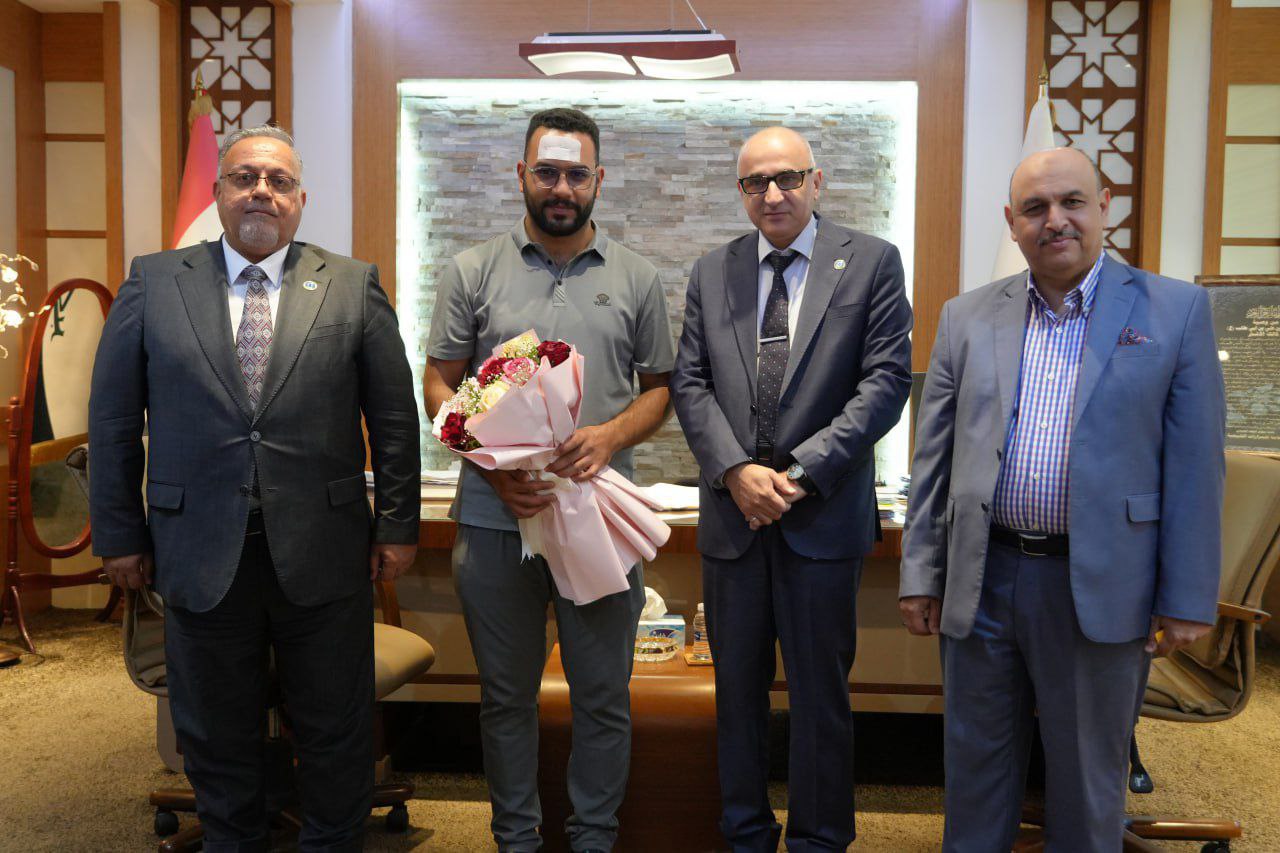 استقبل رئيس جامعة بغداد، الأستاذ الدكتور بهاء إبراهيم إنصاف، بحضور مساعديه للشؤون العلمية والإدارية، الطالب مرتضى جبار جري من قسم هندسة الميكاترونيكس في كلية الهندسة الخوارزمي، للاطمئنان على صحته بعد تعرضه لحادث في إحدى حافلات الحرم الجامعي.