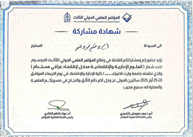 شارك المعهد العالي للدراسات المحاسبية والمالية بجامعة بغداد في المؤتمر العلمي الدولي الثالث لكلية الإدارة والاقتصاد بجامعة وارث الأنبياء ، حيث قدم الأستاذ المساعد الدكتور حكيم حمود فليح، التدريسي في المعهد ببحث علمي حمل عنوان (دور المدقق الداخلي في تقييم مخاطر الذكاء الاصطناعي وفق المتطلبات الدولية في القطاع المصرفي العراقي باستخدام برنامجPower BI )بالتعاون مع اساتذة في جامعات عراقية .