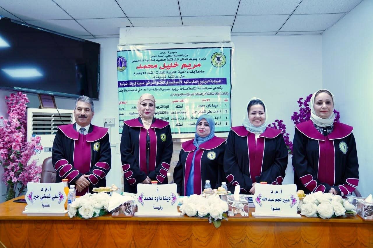 شهدت كلية التربية للبنات المناقشة العلنية لطالبة الماجستير (مريم خليل محمد كاظم ) في قسم الإجتماع عن رسالتها الموسومة بـ” السياحة الدينية وانعكاساتها الاجتماعية في المجتمع العراقي مدينة كربلاء أنموذجا / دراسة اجتماعية ميدانية في مدينة بغداد ”