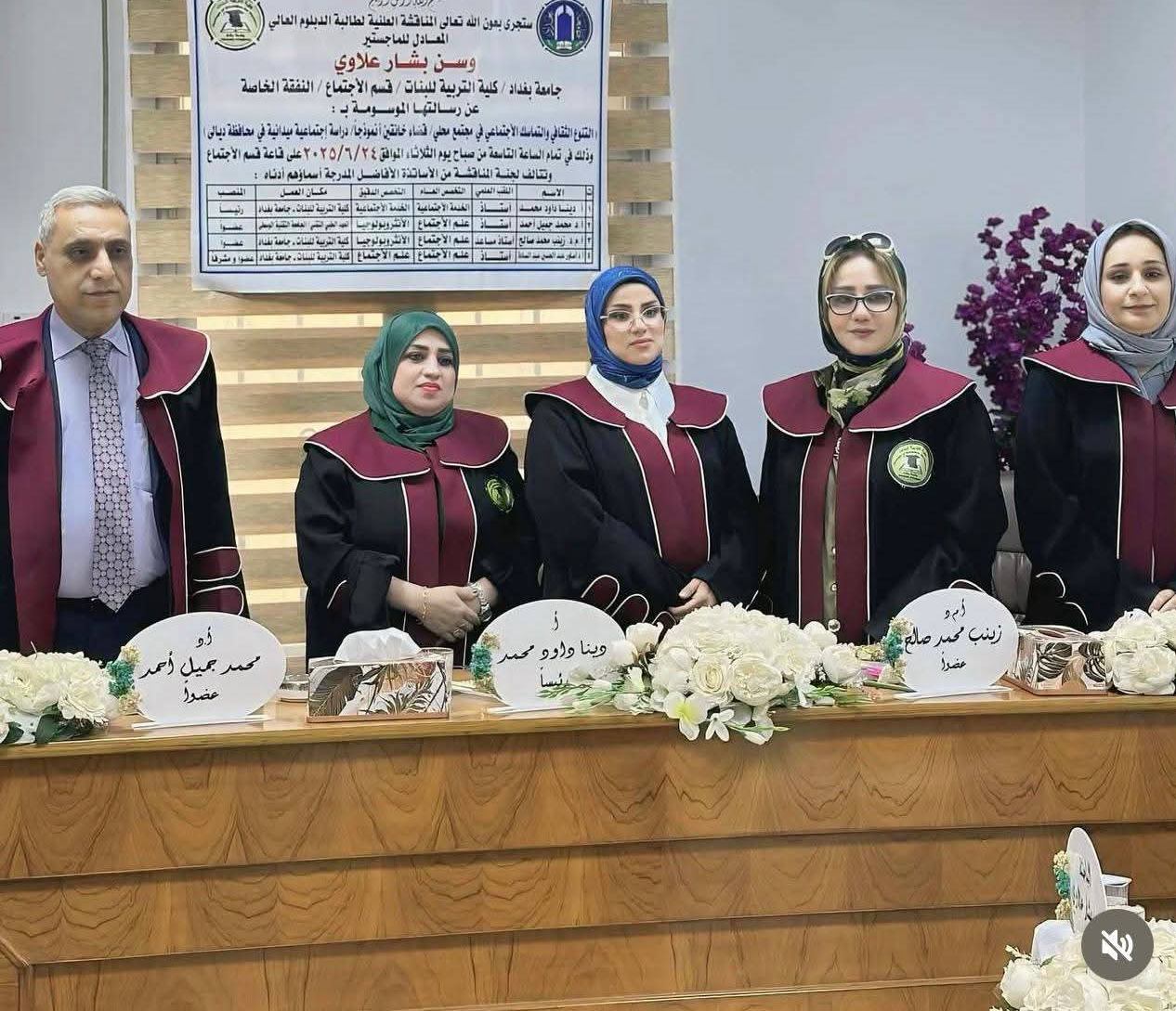 شهدت كلية التربية للبنات المناقشة العلنية لطالبة الدبلوم العالي المعادل للماجستير (وسن بشار علاوي عبد) في قسم الاجتماع عن رسالتها الموسومة بـ(( التنوع الثقافي والتماسك الاجتماعي في مجتمعا محلي /قضاء خانقين أنموذجا/ دراسة اجتماعية ميدانية في محافظة ديالى))