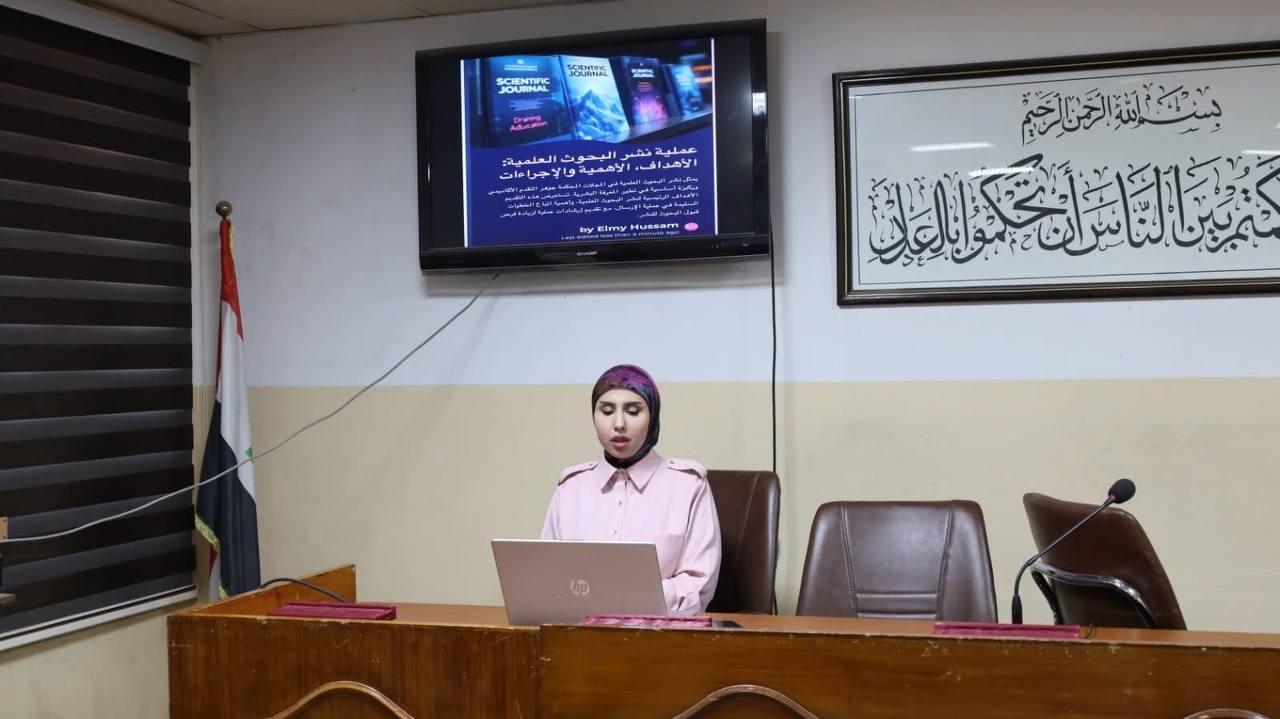 نظّمت كلية القانون بجامعة بغداد ورشة عمل علمية بعنوان “خطوات إرسال البحث إلى المجلات العلمية: مجلة العلوم القانونية أنموذجاً قدّمتها المدرس المساعد إيمان حسام حاتم.