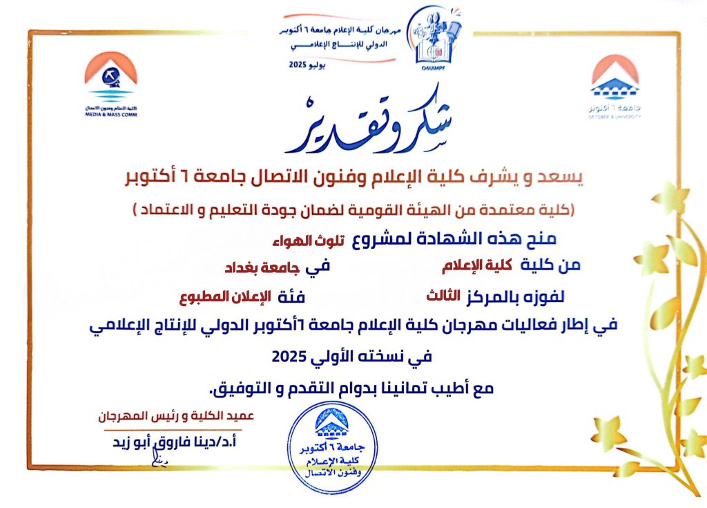 وشهد المهرجان تكريم مشروع “الهدهد” في فئة الصحيفة المطبوعة بالمركز الأول، فيما حصل مشروع “تلوث الهواء” في فئة الإعلانات المطبوعة على المركز الثالث، متفوقَين على عشرات المشاركات الأخرى، ما يعكس المستوى الأكاديمي والمهني الرفيع الذي بلغه طلبة كلية الإعلام في جامعة بغداد.