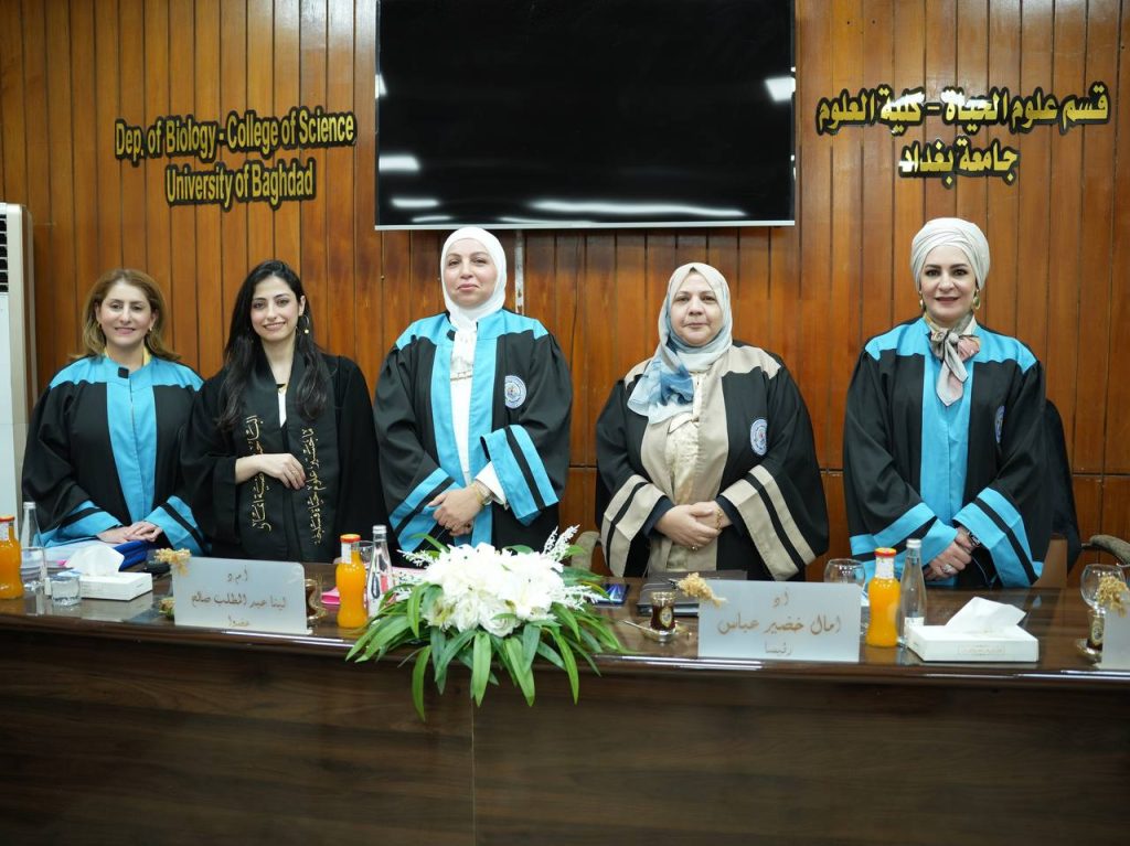 ناقش قسم علوم الحياة بكلية العلوم في جامعة بغداد، رسالة الماجستير الموسومة “ﺗﻘﯾﯾم دور ﻋﺎﻣل اﻟﻧﻣو اﻟﻣﺷﯾﻣﻲ وﺑﻌض اﻟﻣﻌﺎﯾﯾراﻟﻔﺳﯾوﻟوﺟﯾﺔ ﻓﻲ اﻟﻛﺷف ﻋن ﺷدة ﻣﻘدﻣﺎت اﻻرﺗﻌﺎج اﻟﺣﻣﻠﻲ ﻓﻲ ﻋﯾﻧﺔ ﻣن اﻟﻧﺳﺎء اﻟﻌراﻗﯾﺎت للطالبة رضية أنمار مرتضى .
