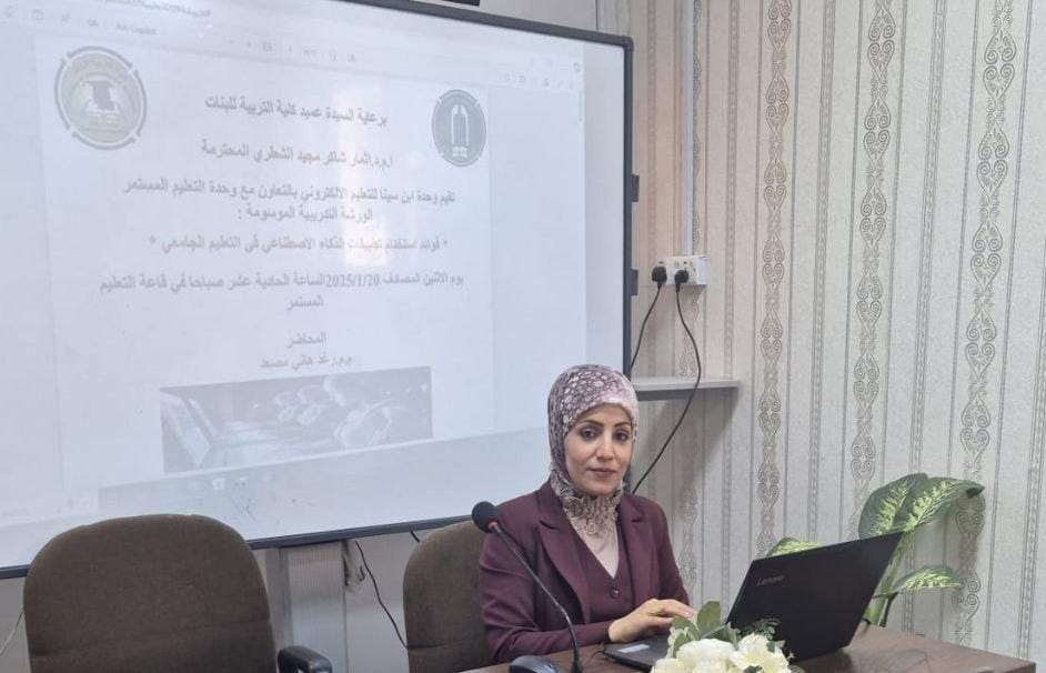 أقامت كُلية التربية للبنات وحدة اِبن سينا للتعليم الإلكتروني بالتعاون مع وحدة التعليم المستمر الورشة التدريبية الموسومة (فوائد اِستخدام تطبيقات الذكاء الاصطناعي في التدريس)، حاضَر فيها المُدرِّس المُساعد رغد هاني مصعد.