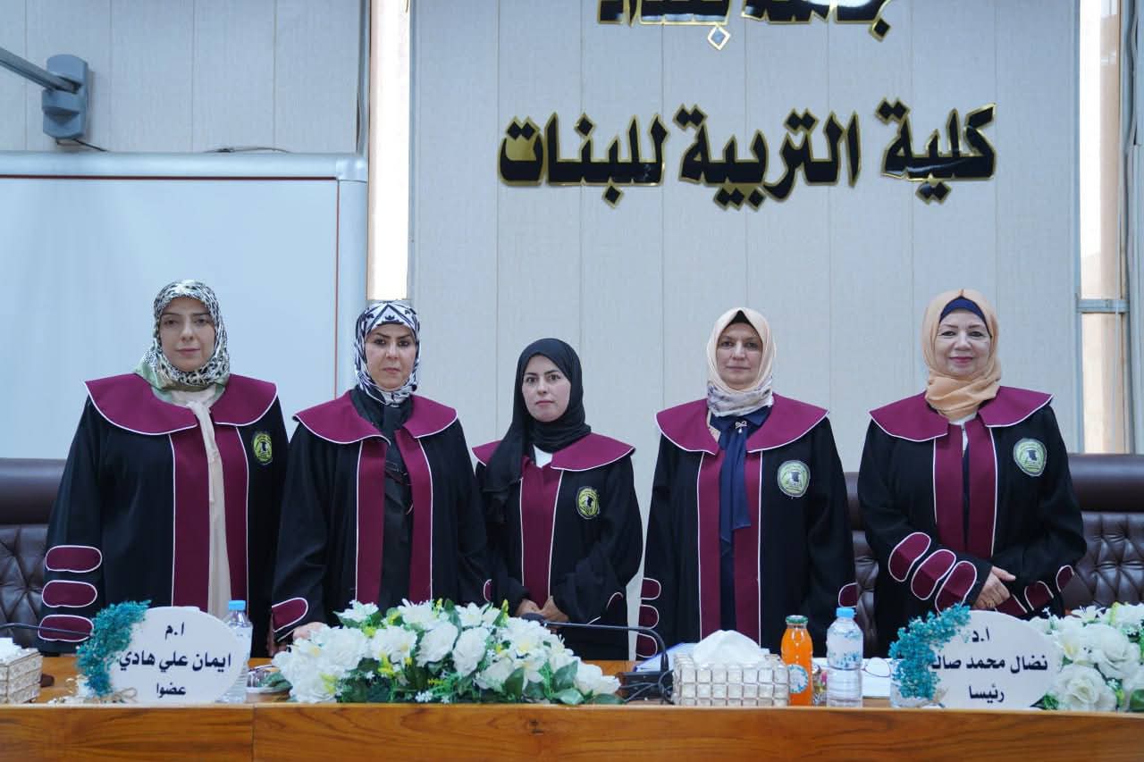شهدت كلية التربية للبنات المناقشة العلنية لطالبة الماجستير(فاطمة شفاء عباس كاظم) في قسم الاقتصاد المنزلي عن رسالتها الموسومة (دراسة استخلاص صمغ بذور لسان الحمل وخواصه النوعية واستعماله في صناعة الكيك المختبري).