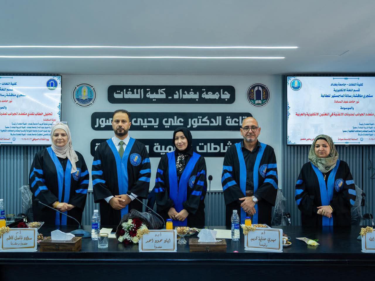 ناقش قسم اللغة الإنجليزية في كلية اللغات بجامعة بغداد، رسالة الماجستير الموسومة (التحليل النقدي متعدد الوسائط لمدونات الطعام باللغتين الإنجليزية والعربية) للطالبة نور حامد عبد السادة.
