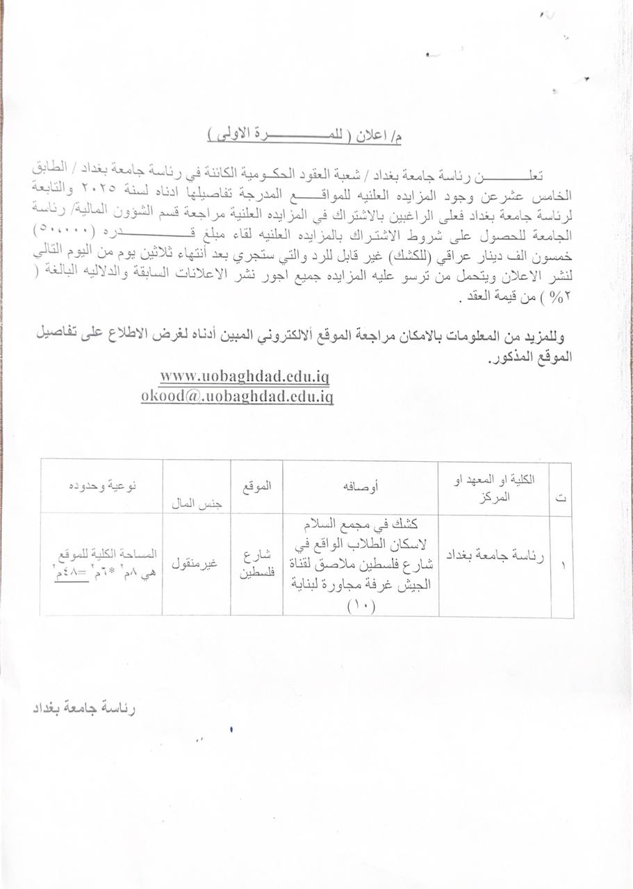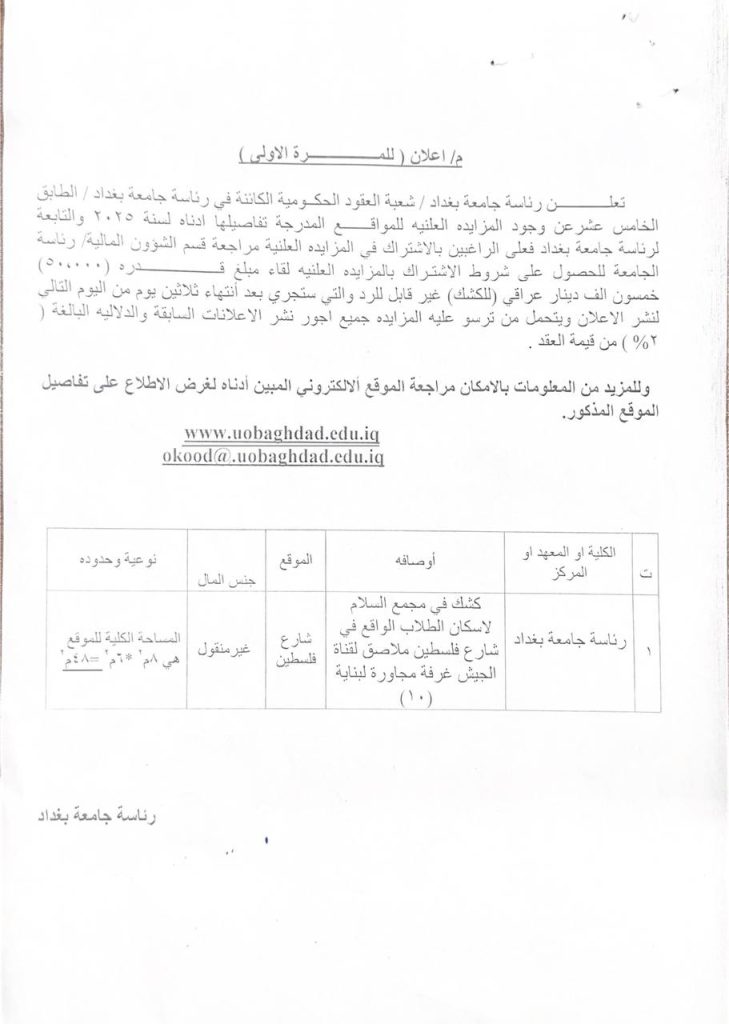 عن وجود مزايدة علنية للمواقع المذكورة تفاصيلها في الموقع ادناه لسنة 2025 والتابعة لرئاسة جامعة بغداد فعلى الراغبين بالاشتراك في المزايدة العلنية مراجعة قسم الشؤون المالية/ رئاسة جامعة بغداد للحصول على شروط الاشتراك بالمزايدة العلنية لقاء مبلغ قدره (50,000) خمسون الف دينار عراقي (للكشك) غير قابلة للرد والتي ستجري بعد انتهاء اثلاثين يوم من اليوم التالي لنشر الاعلان ، ويتحمل من ترسو عليه المزايدة اجور نشر الاعلان والدلالية البالغة (٢٪) من قيمة العقد .