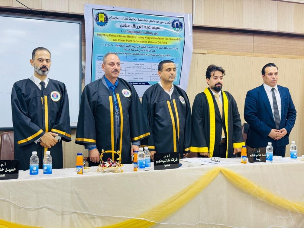 شهدت كلية الهندسة المناقشة العلنية لطالب الماجستير سيف عبد الرزاق عباس من قسم هندسة الطاقة، عن رسالته الموسومة (إعادة تدوير الغاز المستنفذ لتعزيز أداء محطة توليد الطاقة الغازية في حقل الغراف النفطي باستخدام محاكاة HYSYS”).