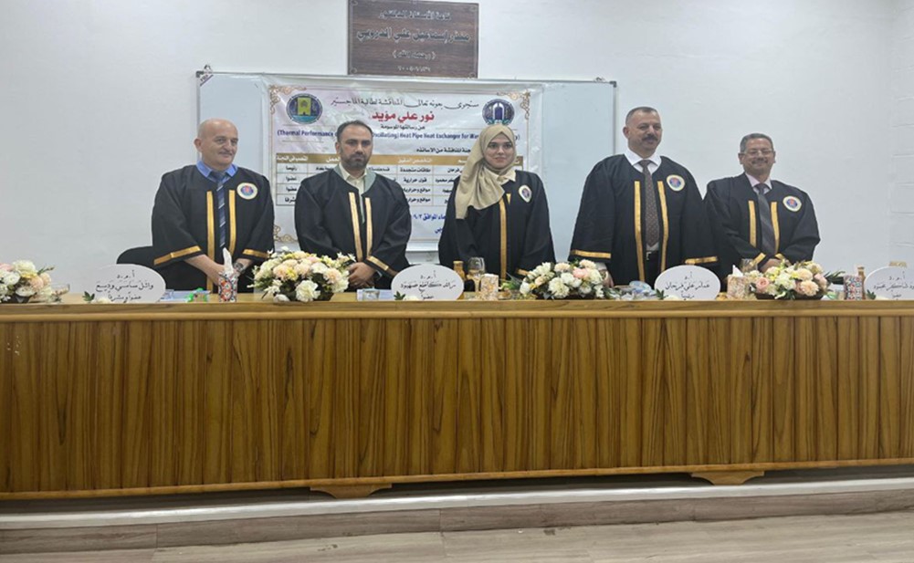 شهدت كلية الهندسة في جامعة بغداد المناقشة العلنية لطالبة الماجستير نور علي مؤيد من قسم هندسة الميكانيك عن رسالتها الموسومة ب(الأداء الحراري لمبادل حراري متكون من أنبوب حراري نابض (متذبذب) لاستعادة الحرارة المهدورة).