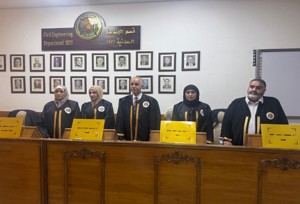 شهدت كلية الهندسة في جامعة بغداد المناقشة العلنية لطالبة الماجستير رواء رافع خضير من قسم الهندسة المدنية/ ميكانيك التربة وهندسة الأسس، عن رسالتها الموسومة ب(تقييم تجريبي ورياضياتي للأساس ذو الحواف المرنة مقارنةً مع الأساس الدائري على الرمل المسلح).