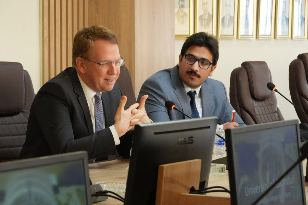 استقبل الأستاذ الدكتور بهاء إبراهيم إنصاف رئيس جامعة بغداد ، السفير الفرنسي في العراق باتريك دوريل والوفد المرافق له، بحضور الأستاذ الدكتور سهيل نجم عبد الله المساعد العلمي لرئيس الجامعة، والدكتور صادق عواد كاظم معاون مدير دائرة البعثات والعلاقات الثقافية في وزارة التعليم العالي والبحث العلمي، والأستاذ الدكتور علي عدنان مشوش عميد كلية اللغات ، وعدد من المعنيين في جامعة بغداد .