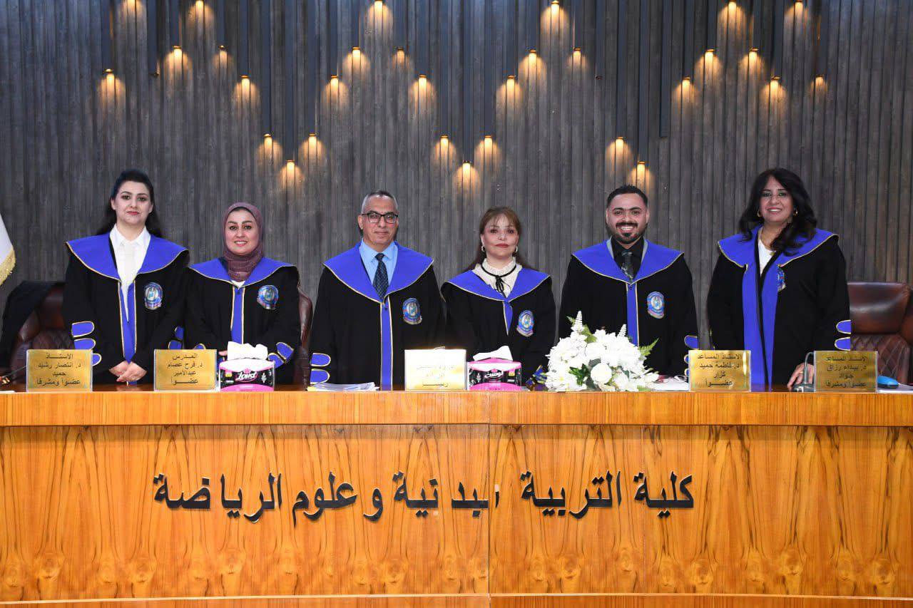 ناقشت كلية التربية البدنية وعلوم الرياضة بجامعة بغداد رسالة ماجستير للطالب سجاد معين عبدالحسين بعنوان (تمرينات بمصاحبة جهاز السير ضد الجاذبية في تأهيل إصابة تمزق الرباط الانسي المتوسط للكاحل في بعض الفعاليات الرياضية).