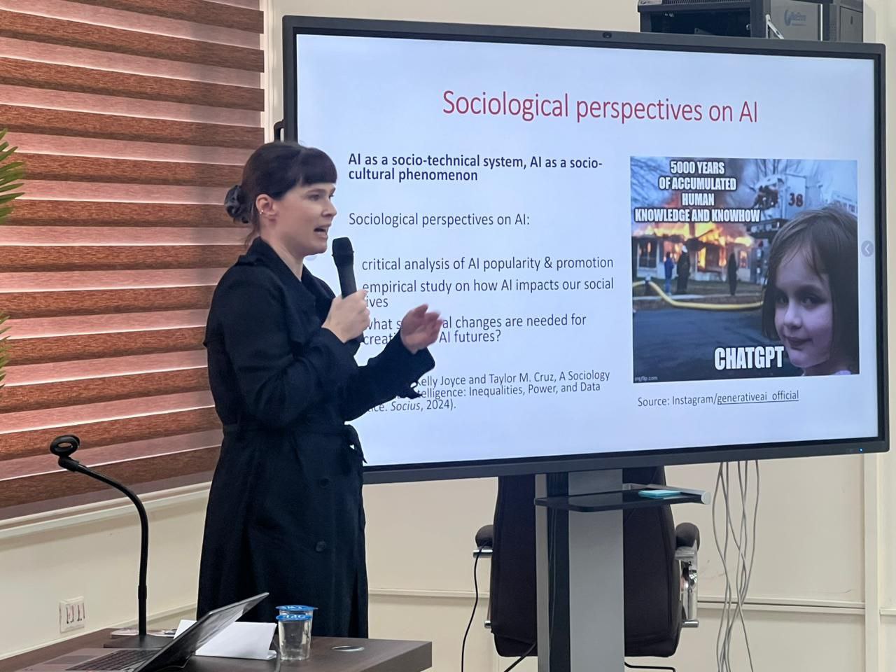 وخلال الحوار المفتوح، طرح عميد الكلية مجموعة من الأسئلة التي سلّطت الضوء على أهم المشكلات التي يواجهها الطلبة في عامهم الأول، طالباً من الباحثة الضيفة تقديم رؤيتها وخبرتها الدولية في كيفية التعامل مع هذه التحولات. وفي ردّها، أكدت الدكتورة دوروتا أن طلبة الذكاء الاصطناعي ينتمون إلى أحد أهم التخصصات المستقبلية، مشيرةً إلى أن النجاح الحقيقي لا يتحقق بالمعرفة التقنية وحدها، بل بتكاملها مع الوعي الأخلاقي. وقالت مخاطبة الطلبة: “التقنية من دون قيم قد تخلّف ضرراً، أما التقنية التي تقودها الأخلاق فتصنع عالماً أفضل للجميع.”