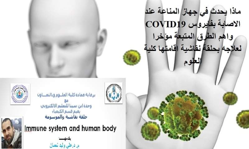 نظم قسم الكيمياء بالتعاون مع وحدة ابن سينا للتعليم الالكتروني في كلية العلوم بجامعة بغداد حلقة نقاشية افتراضية بعنوان “جهاز المناعة وجسم الانسان” بمشاركة تدريسيين وباحثين وطلبة دراسات عليا في داخل الكلية وخارجها .