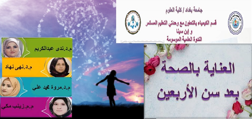 اقام قسم الكيمياء بالتعاون مع وحدتي ابن سينا للتعليم الالكتروني والتعليم المستمر في كلية العلوم بجامعة بغداد الندوة العلمية الافتراضية الموسومة “العناية بالصحة بعد سن الاربعين” بمشاركة عدد من الطلبة والباحثين والمعنيين بالعلوم الطبية .