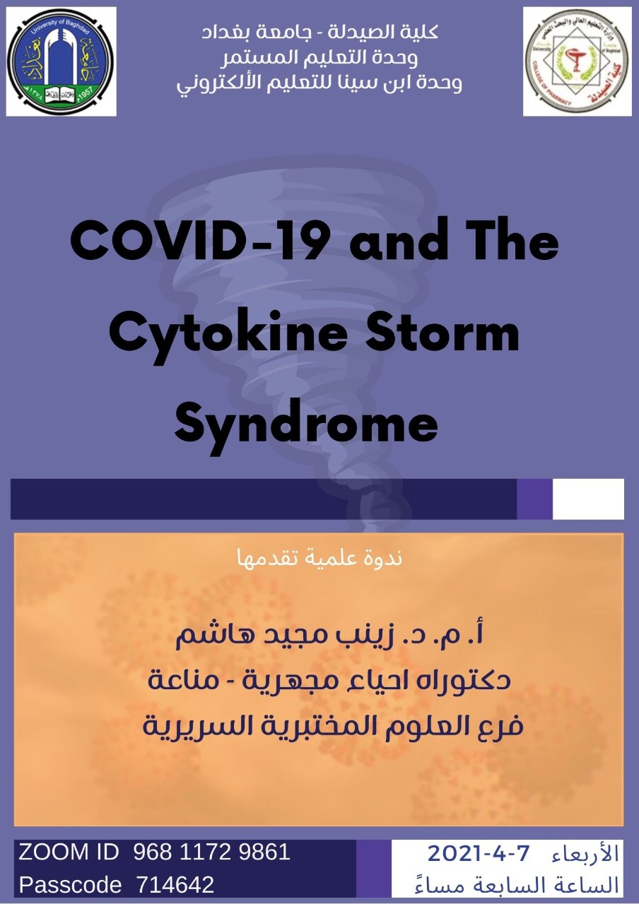 نظمت كلية الصيدلة بجامعة بغداد ورشة عمل الكترونية بعنوان (كوفيد-19 ومتلازمة عاصفة السايتوكين) القتها أستاذ مساعد دكتور زينب مجيد الحكيم ماجستير فسلجه غدد صم وتكاثر ,دكتوراه احياء مجهرية- مناعة من كلية الطب الجامعة المستنصرية و التدريسية في فرع العلوم المختبرية السريرية في كلية الصيدلة جامعة بغداد .
