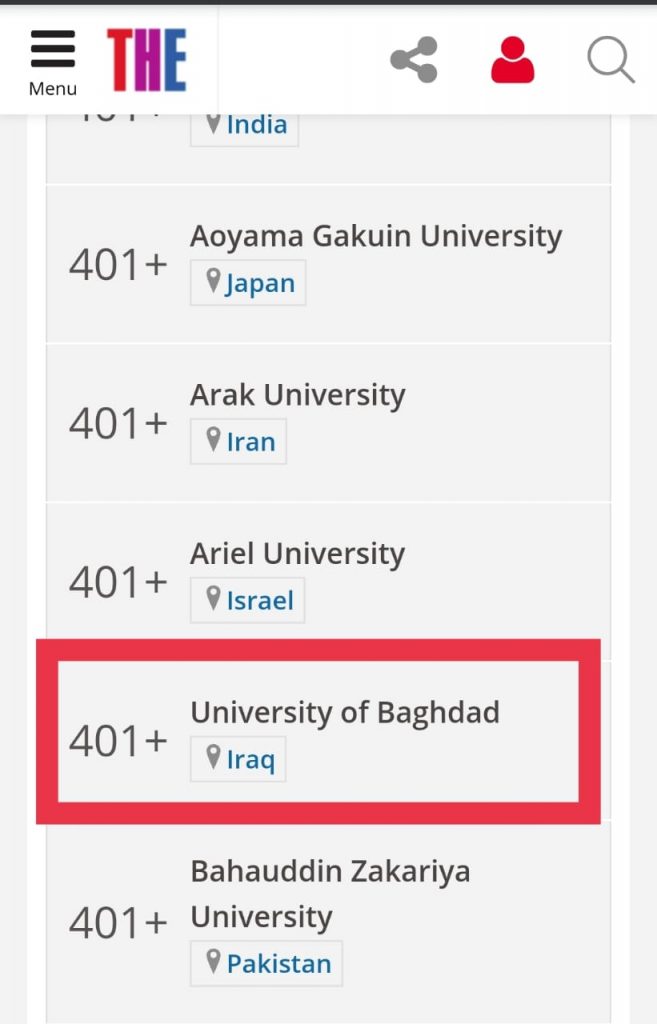 و يذكر أن جامعة بغداد كانت قد دخلت تصنيف التايمز البريطاني لأفضل الجامعات في العالم