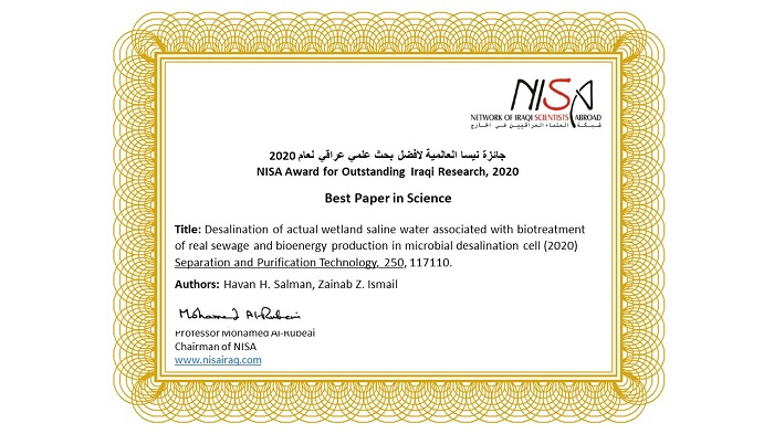 حصلت تدريسية في قسم الهندسة البيئية كلية الهندسة الاستاذ الدكتور زينب زياد اسماعيل في قسم الهندسة البيئية على جائزة نيسا العالمية الممنوحة من شبكة العلماء العراقيين في الخارج (NISA) لافضل بحث علمي عراقي للعام 2020 وذلك للبحث الموسوم: