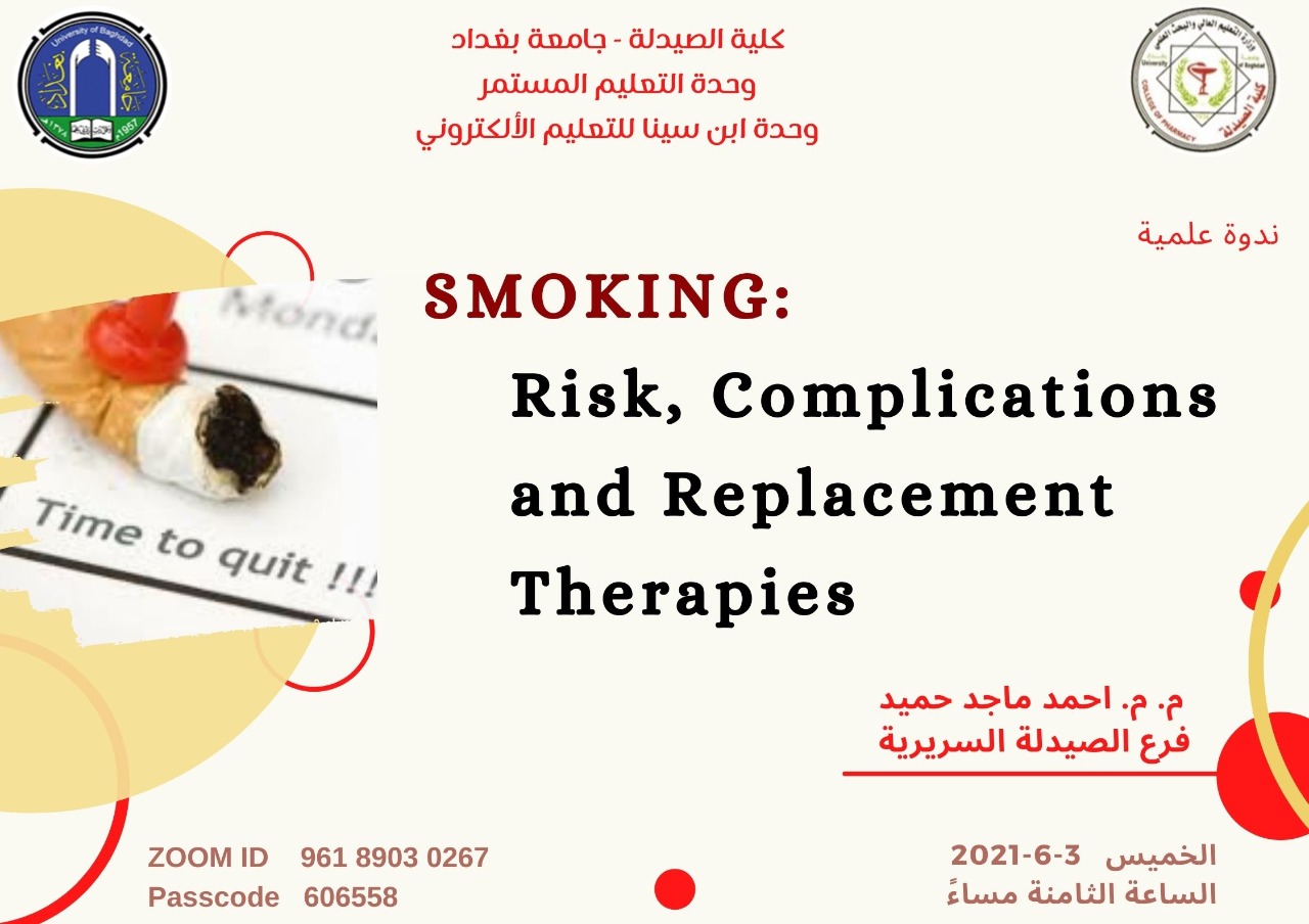 نظمت كلية الصيدلة بجامعة بغداد سلسله محاضرات علمية توعوية حول مضار التدخين ومنتجات التبغ وتأتي هذه المحاضرات ضمن جهود وزارة التعليم العالي والبحث العلمي لمكافحة التبغ في المؤسسات التعليمية في ظل جائحة كورونا حيث قدم مجموعة من تدريسيي الكلية محاضرات توعوية لطلبة الدراسات الاولية والعليا ولمدة 3 أيام عبر تطبيق zoom .