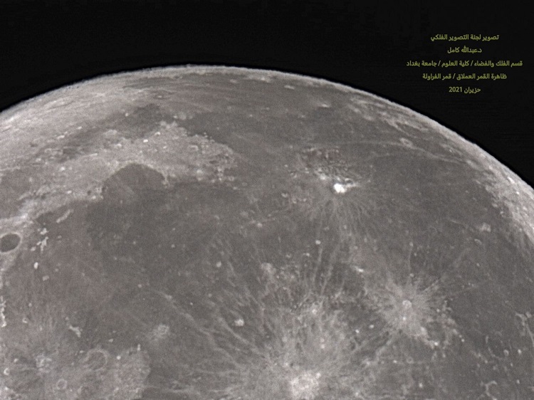 وقد تمكن عضو لجنة لرصد والتصوير الفلكي الاستاذ المساعد الدكتور عبد الله كامل التدريسي في القسم من رصد وتصوير القمر ليلة الجمعة (٢٤ / ٢٥ حزيران يونيو ٢٠٢١) باستخدام كاميرا سي سي دي حديثة وتليسكوب ١١ انج، من اتجاهات عديدة وكانت نتائج الصور وافية ضمن متطلبات التصوير الفلكي للاختصاص العلمي الدقيق، فضلا عن قيامه بتدريب الطلبة مختبريا حول طرق الرصد باستخدام التليسكوبات والتصوير، الى جانب قيامه باقامة الامسيات الرصدية في كلية العلوم و دائرة الرعاية العلمية في وزارة الشباب والرياضة بوصفه عضوا فاعلا في لجنة الرصد والتصوير الفلكي في قسم الفلك والفضاء.