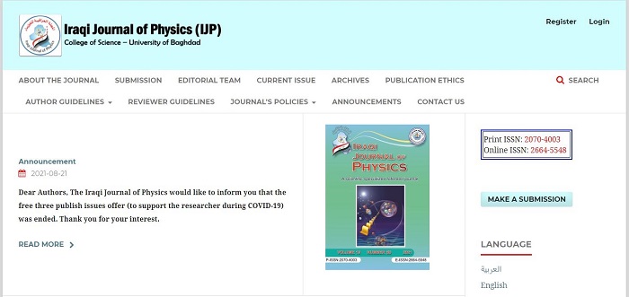 صدر حديثاً في قسم الفيزياء بكلية العلوم جامعة بغداد، العدد الخمسون من المجلة العراقية للفيزياء، المجلد التاسع عشر للعام الحالي وضمن المواعيد المحددة لبرنامج اصدار اعداد المجلة التي تعتمد نظام OJS الالكتروني كليا والخاص باستلام البحوث وتقويمها، فضلا عن اعتمادها نظام برنامج Turin it للاستلال الاالكتروني, والحاصلة على معرف الكائن الرقمي .(DOI: 10.30723)