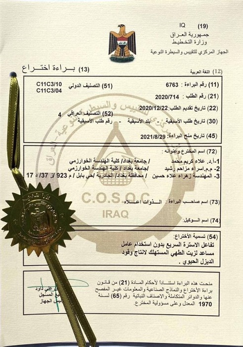 حصل التدريسيان من كلية الهندسة الخوارزمي بجامعة بغداد الاستاذ الدكتورعلاء كريم محمد و المدرس المساعد اسراء مزاحم رشيد على براءة اختراع حول (اجراء تفاعل الاسترة بدون استخدام عامل مساعد وبنسبة تحول تصل الى 99.5% وبزمن قياسي قليل جدا بهدف انتاج وقود الديزل الحيوي) .