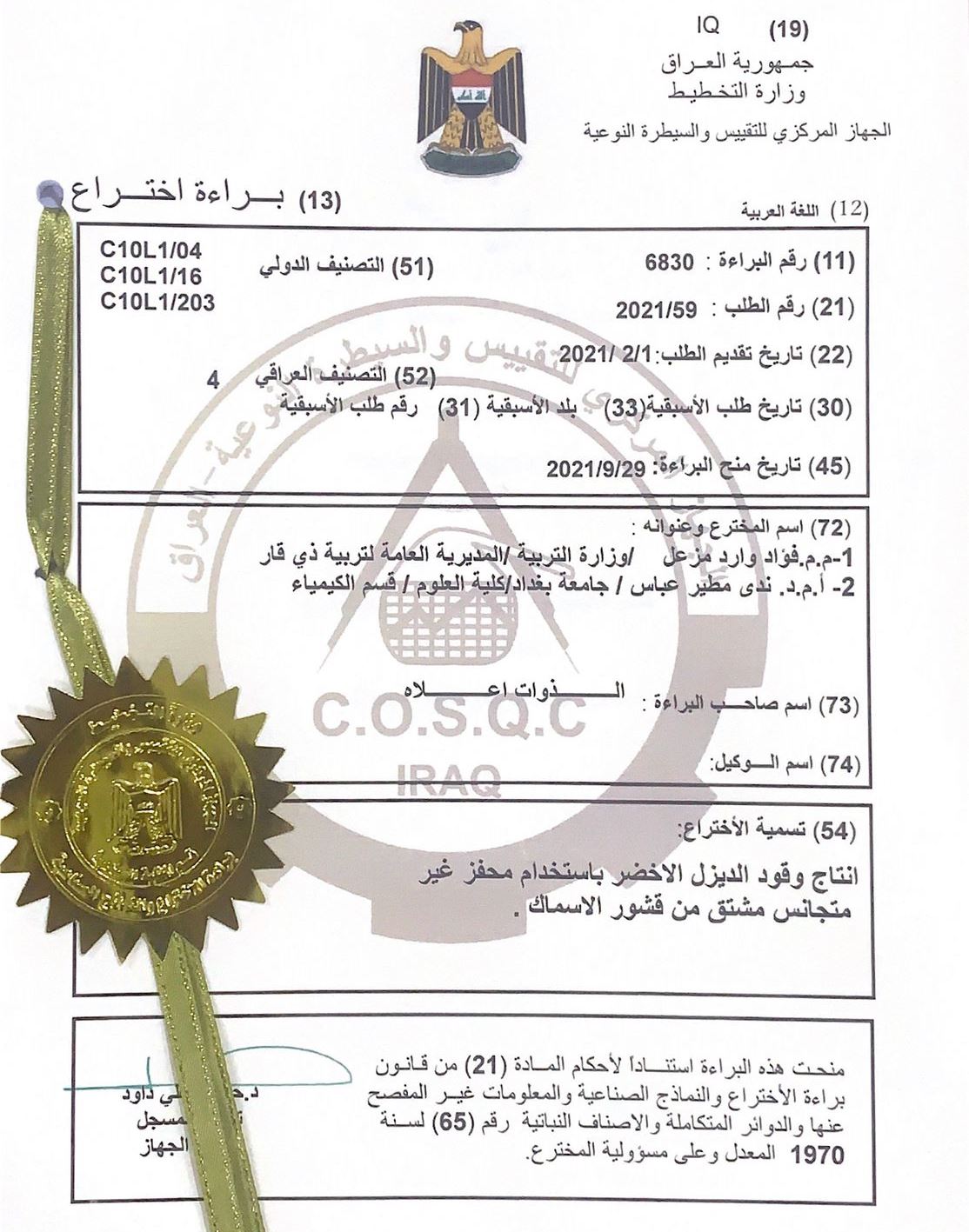 وهدفت البراءة التي حملت عنوان “انتاج وقود الديزل الاخضر باستخدام محفز غير متجانس مشتق من قشور الاسماك” الى الوقوف على موضوع مهم وحيوي متعلق بالطاقة والوقود الذي يعد الشغل الشاغل لدى جميع الباحثين في المراكز البحثية والجامعات العالمية في الدول المتقدمة بسبب تنامي الاقتصاد العالمي وعدم استقرار اسعار النفط، مما يدفع الباحثين ودول العالم كافة الى البحث عن مصادر بديلة لانتاج الطاقة.