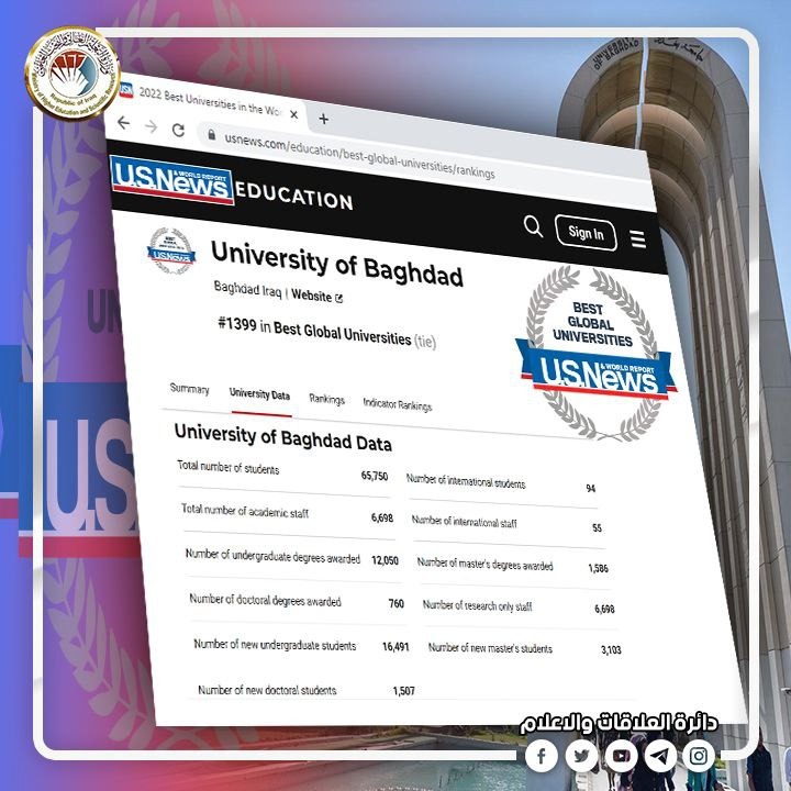 حققت جامعة بغداد مركزا تنافسيا هاما ضمن التصنيف الأمريكي لأفضل الجامعات العالمية للعام 2022 الذي أصدرته مؤسسة (US News & World Report).