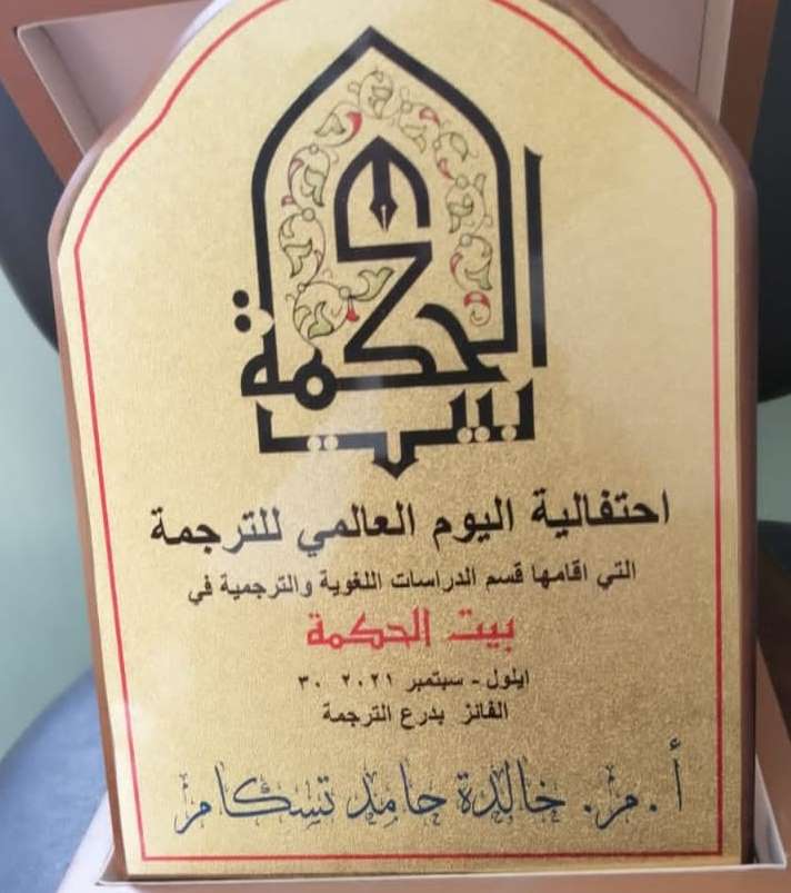 حصلت التدريسية في كلية التربية للبنات قسم اللغة الانكليزية الاستاذ المساعد خالدة حامد تسكام على درع الترجمة بمناسبة اليوم العالمي للترجمة الذي اقيم برعاية قسم الدراسات اللغوية والترجمية في بيت الحكمة وبالتعاون مع نادي الترجمة في الاتحاد العام للكتاب والادباء في العراق
