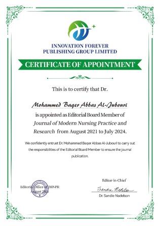 اعلنت جامعة بغداد عن اختيار التدريسي في كلية التمريض الدكتور محمد باقر عباس الجبوري عضوا في هيئة التحرير بمجلة Journal of Modern Nursing Practice and Research العالمية التي تصدرها مؤسسة Innovation Publishing Group Limited في الصين.