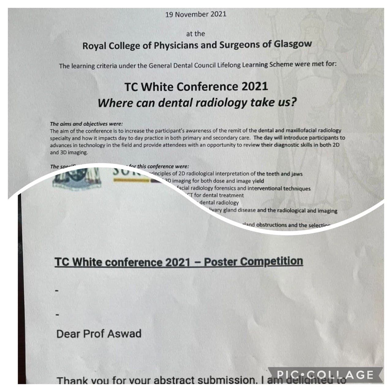 شارك التدريسي في فرع التشخيص الفمي قسم طب الفم في كلية طب الاسنان بجامعة بغداد الاستاذ الدكتور فواز داود الاسود مع طالب الدكتوراه حيدر مهدي عيدان في مؤتمر عالمي علمي (TC white conference 2021)في الكلية الملكيه للأطباء والجراحين في جلاسكو / المملكة المتحدة ( Royal College of Physicians and Surgeons of Glasgow/UK) .