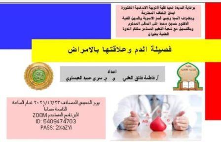 عقد قسم الاقتصاد المنزلي بكلية التربية للبنات ندوته العلمية الموسومة “فصائل الدم وعلاقتها بالأمراض” على المنصة الالكترونية عبر تطبيق (zoom ) .القى المحاضرة كل من الاستاذ فاطمة فائق جمعة و المدرس سرى عبيد نعمة