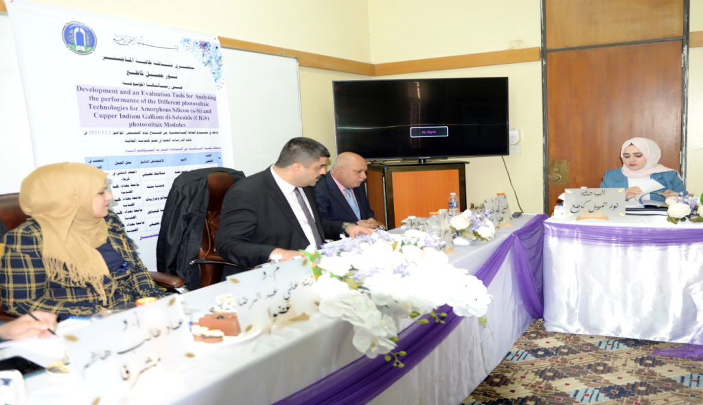 شهدت كلية الهندسة مناقشة رسالة الماجستير للطالبة نور جميل كاطع تخصص هندسة الطاقة عن البحث الموسوم تحليل الاداء للالواح الشمسية السيليكون غير منتظم التبلور (a-si ) والنحاس الانديوم الغاليوم ثنائي سيلينيد(CIGS)