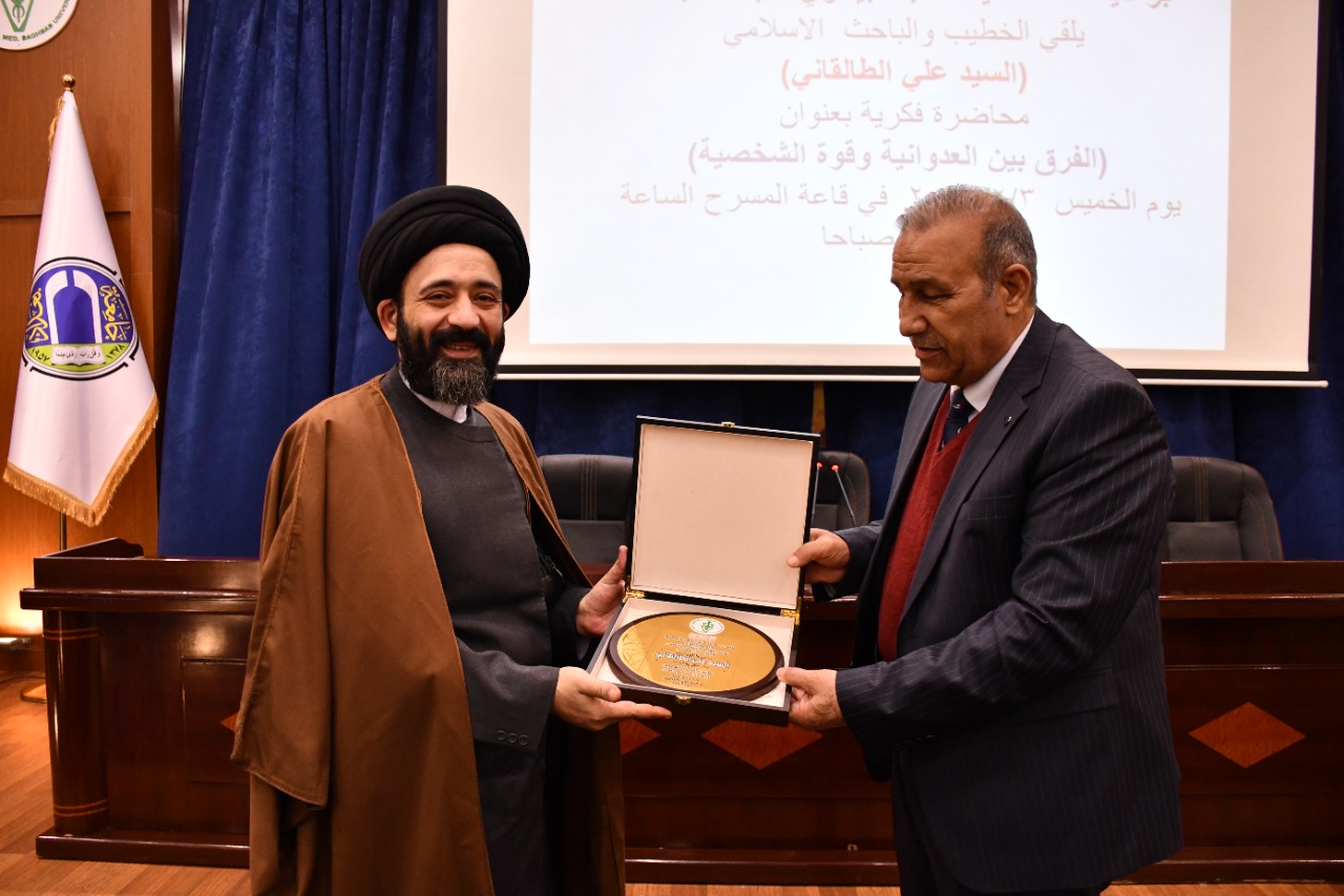 نظمت كلية الطب البيطري في جامعة بغداد محاضرة فكرية القاها الخطيب والباحث الاسلامي السيد علي الطالقاني بعنوان ( الفرق بين العدوانية وقوة الشخصية )، بحضور ممثلا عن رئيس جامعة بغداد وعميد كلية الطب البيطري الاستاذ الدكتور حميد علي كاظم، ومعاونيه ورؤساء الفروع العلمية وجمع غفيرمن تدريسي وطلبة الكلية.
