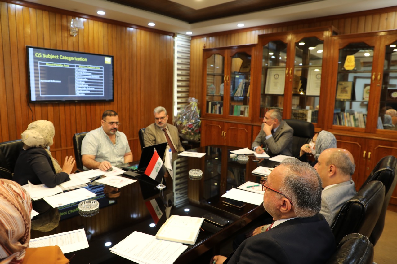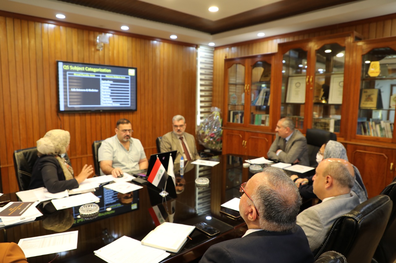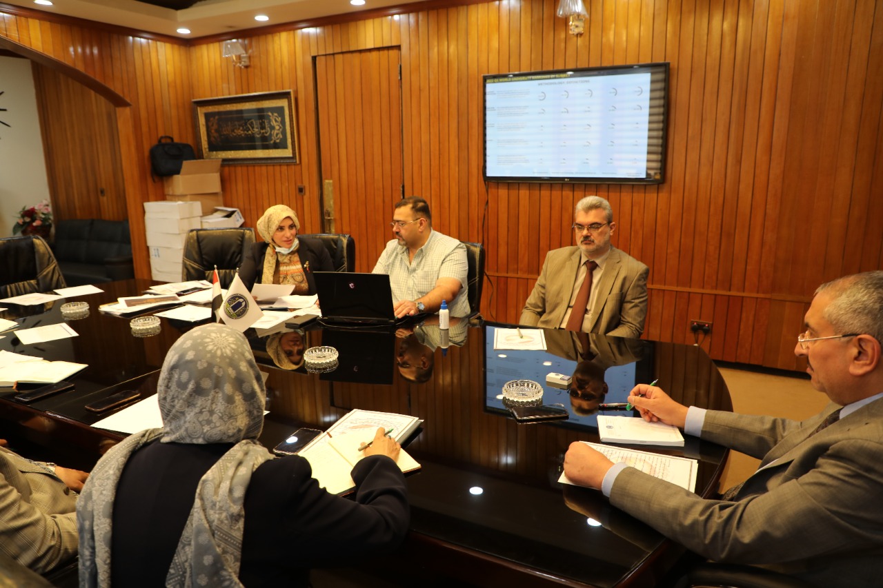 نظم مجلس ضمان الجودة والاعتماد الاكاديمي اجتماعا في رئاسة جامعة بغداد لمناقشة المراتب المتحققة في تصنيفي Qs وScimago بحضور رئيس جامعة بغداد الاستاذ الدكتور منير حميد السعدي ومساعد رئيس الجامعة للشؤون العلمية الاستاذ الدكتور مروان عبد الحميد عاشور وعدد من عمداء الكليات ومدير قسم ضمان الجودة والاداء الجامعي الاستاذ المساعد الدكتورة رنا ثابت عبد .