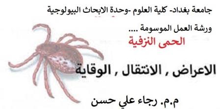 وتضمنت الورشة التي قدمتها المدرسة المساعدة رجاء علي حسن التعريف بكيفية اصابة الحيوانات بالعدوى عن طريق لدغة القرادات المصابة، مبينة بقاء الفيروس في مجرى دم الحيوانات لمدة أسبوع تقريباً بعد إصابتها بعدواه، مما يسمح باستمرار دورة انتقال العدوى من القرادات إلى الحيوانات ثم منها إلى القرادات ثانيةً عندما يلدغها قراد آخر، كاشفة انه وعلى الرغم من أن عدداً من أجناس القراد يمكن أن تصاب بفيروس حمى القرم– الكونغو النزفية، إلا أن الناقل الرئيسي للعدوى هو جنس “القراد الزجاجي العين”.